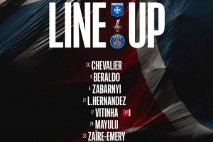 巴黎圣日耳曼首发:30-舍瓦利耶、4-贝拉尔多、6-扎巴尔尼、21-卢卡斯·埃尔南德斯、17-维蒂尼亚、24-马尤卢、33-扎伊尔·埃梅里、7-克瓦拉茨赫利亚、9-贡萨洛·拉莫斯、29-巴尔科拉、49-姆巴耶