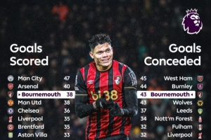 伯恩茅斯本赛季打进38球英超第三多,丢掉43球也是英超第三多