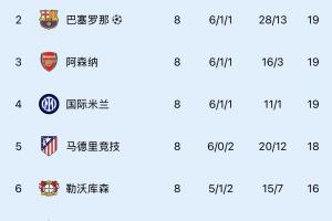 今年欧冠联赛阶段前8名