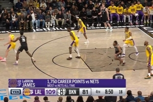 詹姆斯对阵篮网共得到1750分史上最多