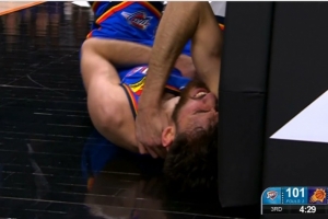 GIF-杰伦威突破撞到了切特 后者痛苦倒地&直接回更衣室 但光速回归