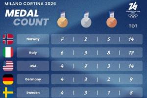 2026米兰冬奥会奖牌榜: