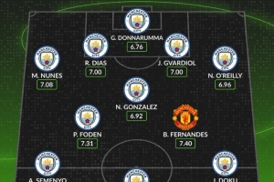 体育资讯1月17日讯 本轮英超曼市德比即将打响,数据网站Whoscored也盘点了两支球队本赛季英超场均评分最高阵容,其中曼城10人入选,具体如下: