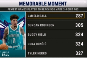 转播方晒出一组数据,NBA历史上投进900记三分所用场数最少的球员榜单如下: