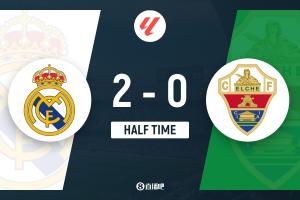 半场-皇马暂2-0埃尔切 巴尔韦德任意球造险+破门吕迪格建功