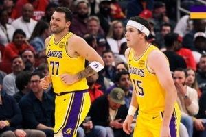 赛后湖人官推发布赢球海报,封面为东契奇和里夫斯。